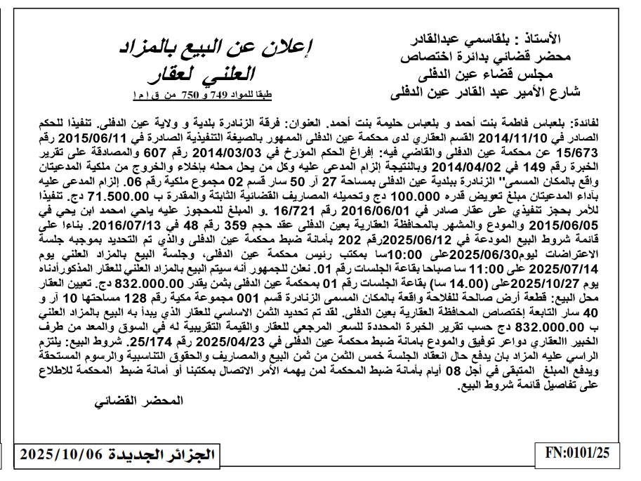 Il sera procédé à la vente au plus offrant et dernier enchérisseur le :
