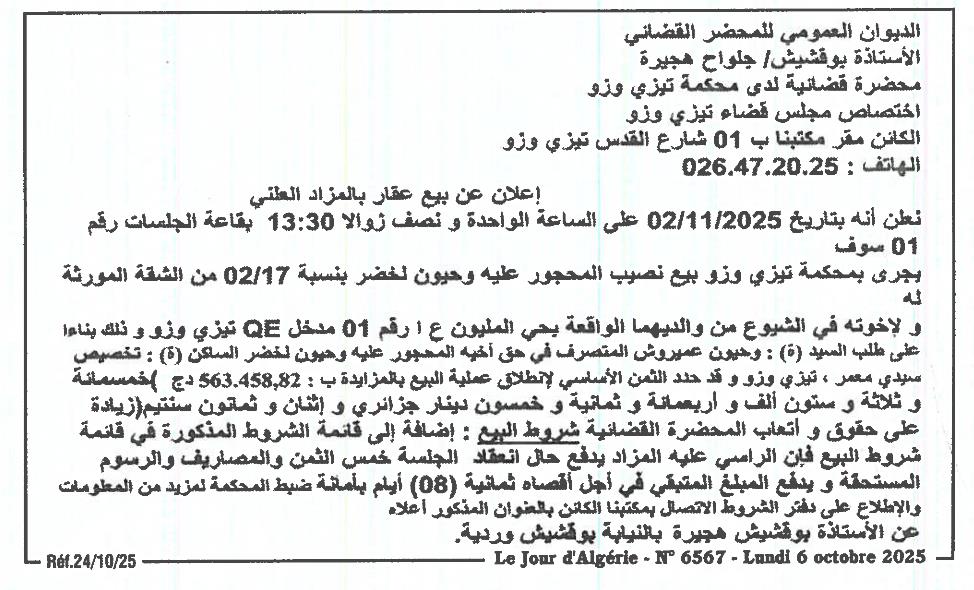 Il sera procédé à la vente au plus offrant et dernier enchérisseur le :