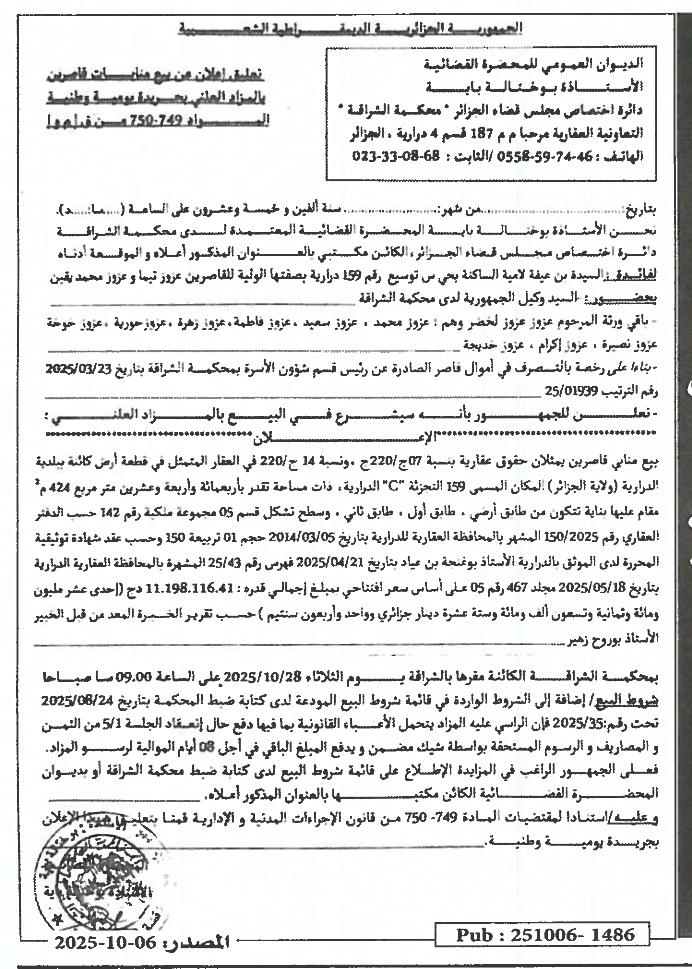Il sera procédé à la vente au plus offrant et dernier enchérisseur le :