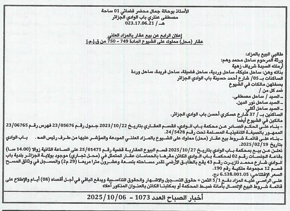 Il sera procédé à la vente au plus offrant et dernier enchérisseur le : 13/10/2025