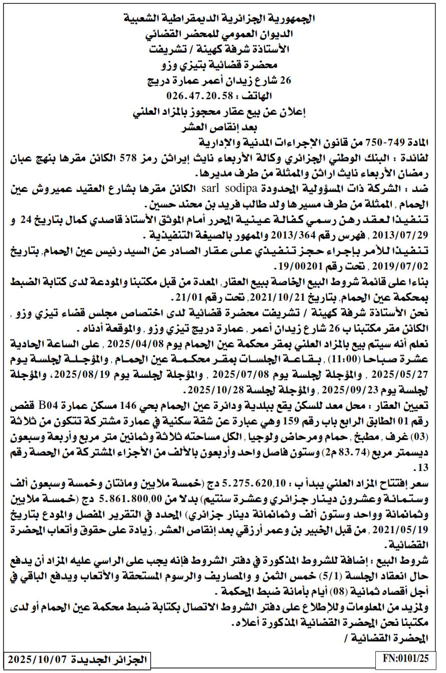 Il sera procédé à la vente au plus offrant et dernier enchérisseur le :