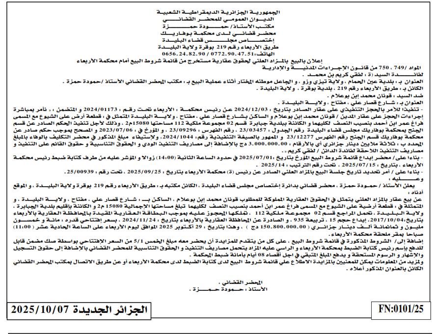 Il sera procédé à la vente au plus offrant et dernier enchérisseur le :