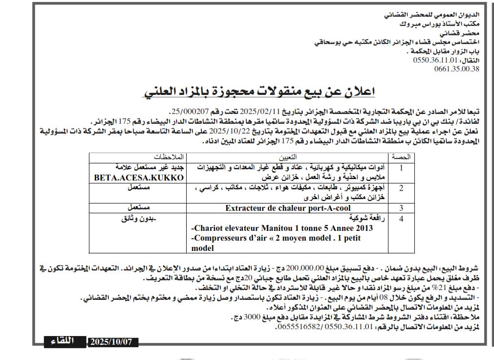 Il sera procédé à la vente au plus offrant et dernier enchérisseur le :