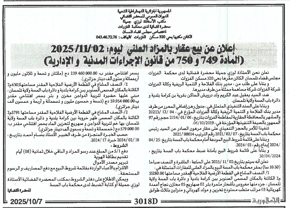 Il sera procédé à la vente au plus offrant et dernier enchérisseur le :