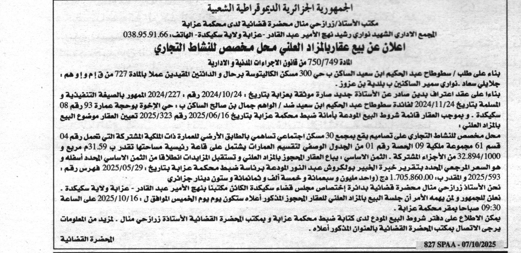 Il sera procédé à la vente au plus offrant et dernier enchérisseur le :