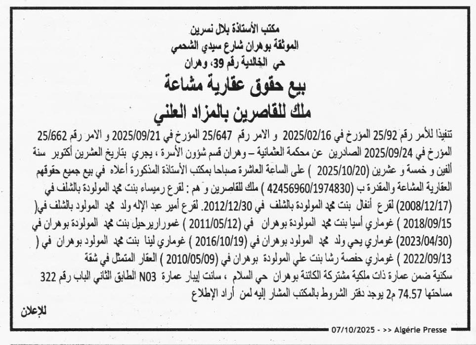 Il sera procédé à la vente au plus offrant et dernier enchérisseur le :
