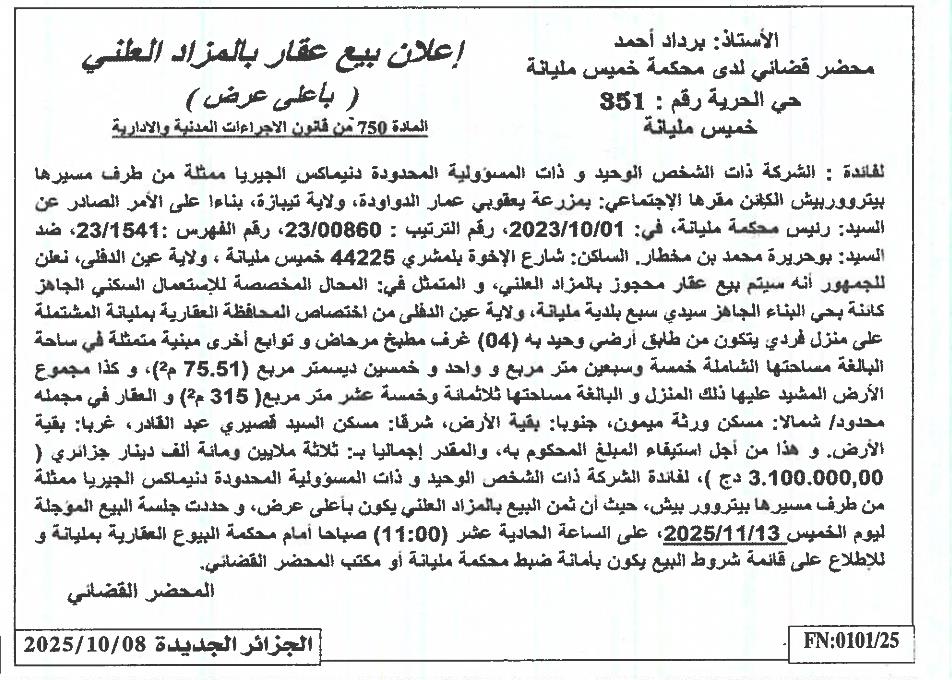 Il sera procédé à la vente au plus offrant et dernier enchérisseur le :