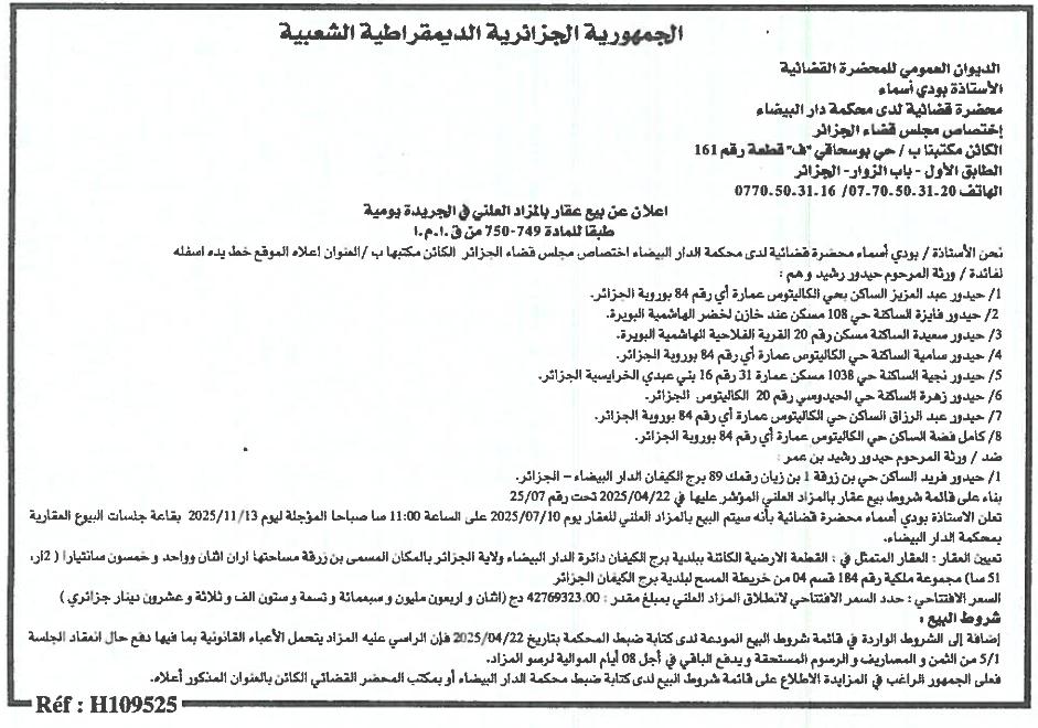 Il sera procédé à la vente au plus offrant et dernier enchérisseur le :