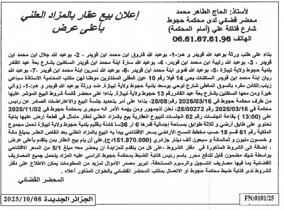 Il sera procédé à la vente au plus offrant et dernier enchérisseur le :