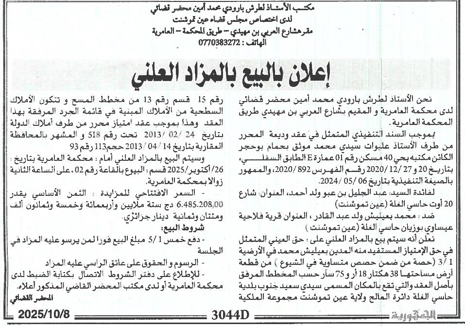 Il sera procédé à la vente au plus offrant et dernier enchérisseur le :