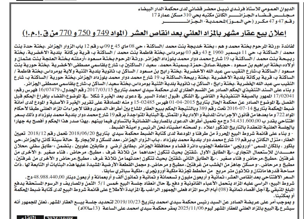 Il sera procédé à la vente au plus offrant et dernier enchérisseur le :