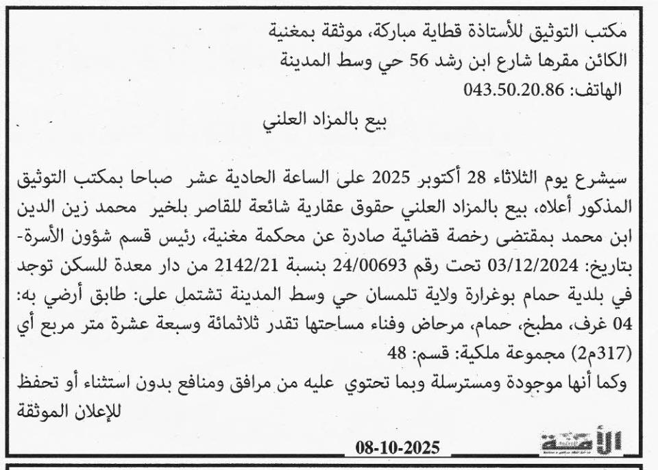Il sera procédé à la vente au plus offrant et dernier enchérisseur le :