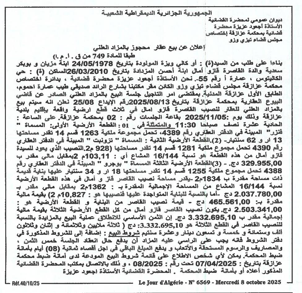 Il sera procédé à la vente au plus offrant et dernier enchérisseur le :