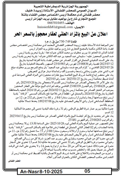 Il sera procédé à la vente au plus offrant et dernier enchérisseur le : 15/10/2025';