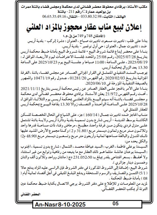 Il sera procédé à la vente au plus offrant et dernier enchérisseur le :