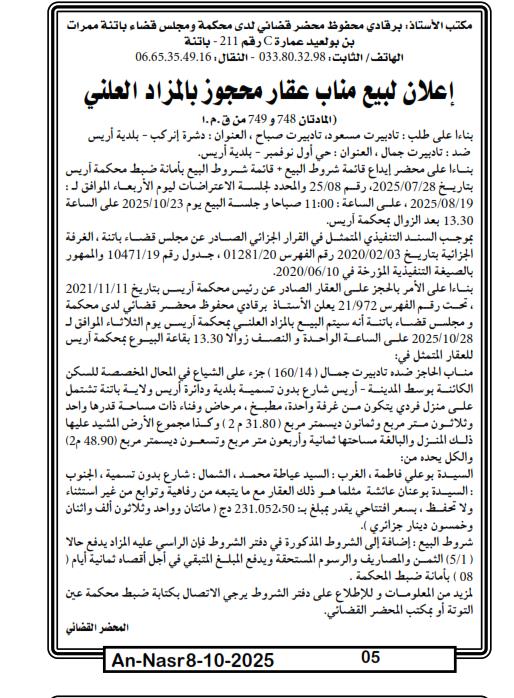 Il sera procédé à la vente au plus offrant et dernier enchérisseur le :