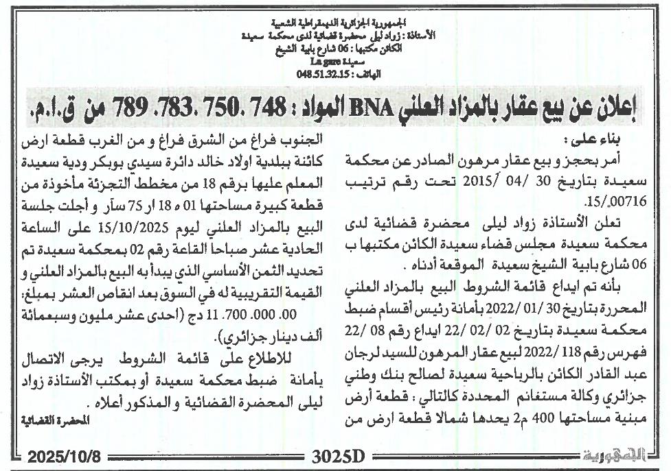 Il sera procédé à la vente au plus offrant et dernier enchérisseur le : 15/10/2025';