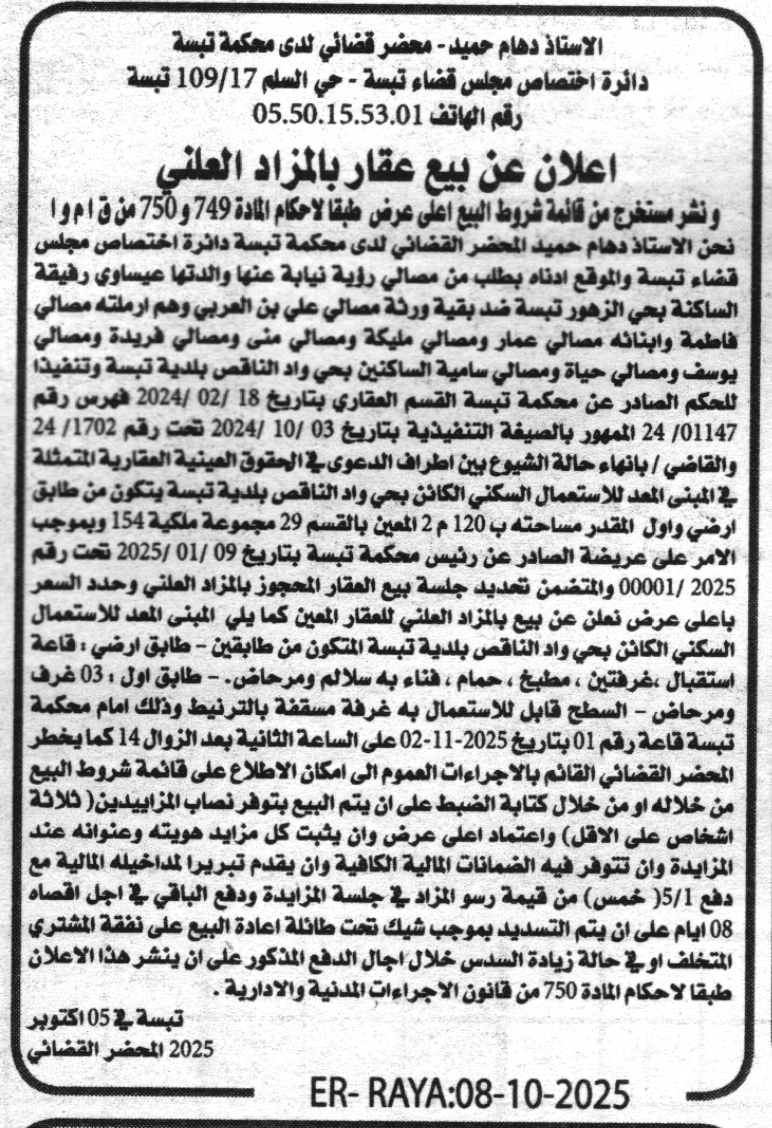 Il sera procédé à la vente au plus offrant et dernier enchérisseur le : 15/10/2025';