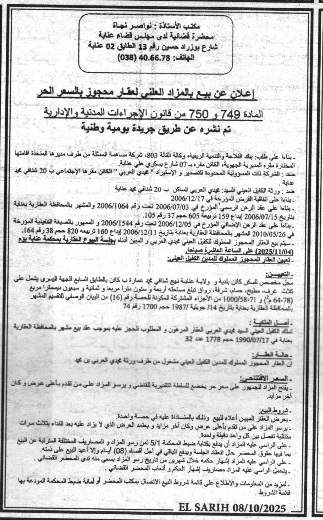 Il sera procédé à la vente au plus offrant et dernier enchérisseur le :