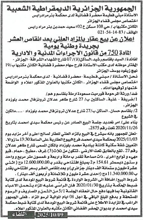 Il sera procédé à la vente au plus offrant et dernier enchérisseur le :