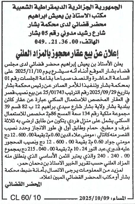 Il sera procédé à la vente au plus offrant et dernier enchérisseur le :