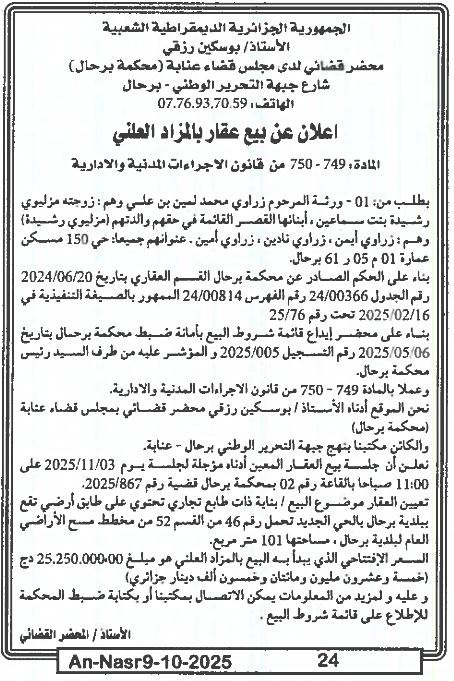 Il sera procédé à la vente au plus offrant et dernier enchérisseur le : 16/10/2025';