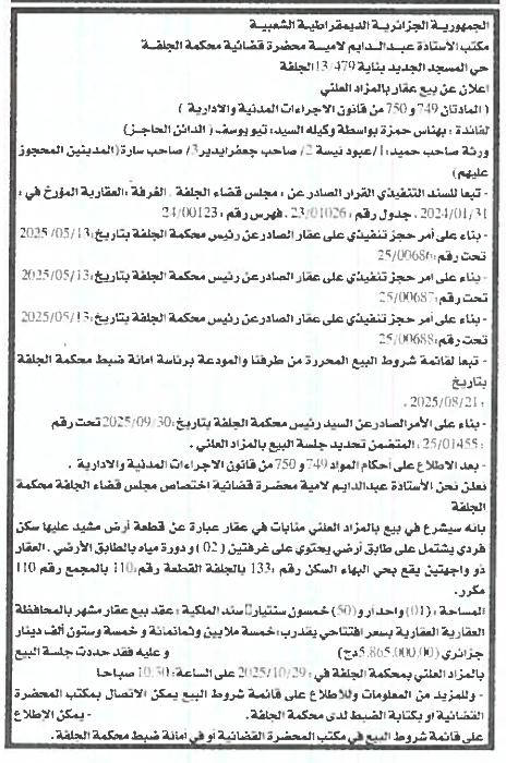 Il sera procédé à la vente au plus offrant et dernier enchérisseur le :