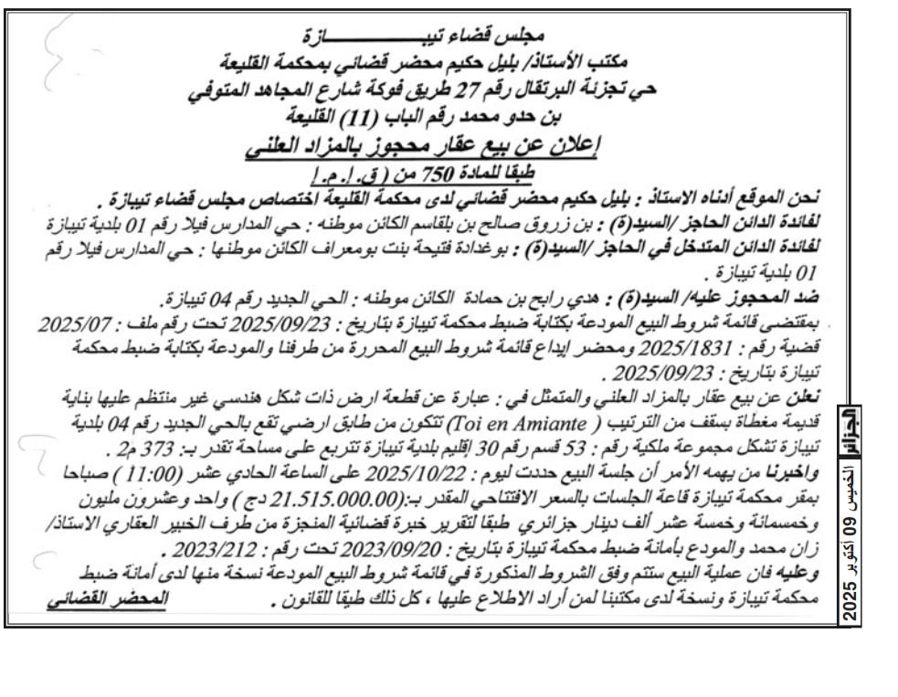 Il sera procédé à la vente au plus offrant et dernier enchérisseur le :