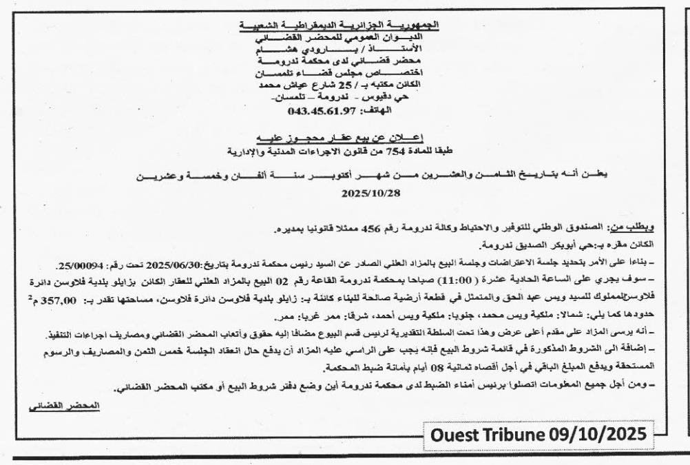 Il sera procédé à la vente au plus offrant et dernier enchérisseur le : 16/10/2025';