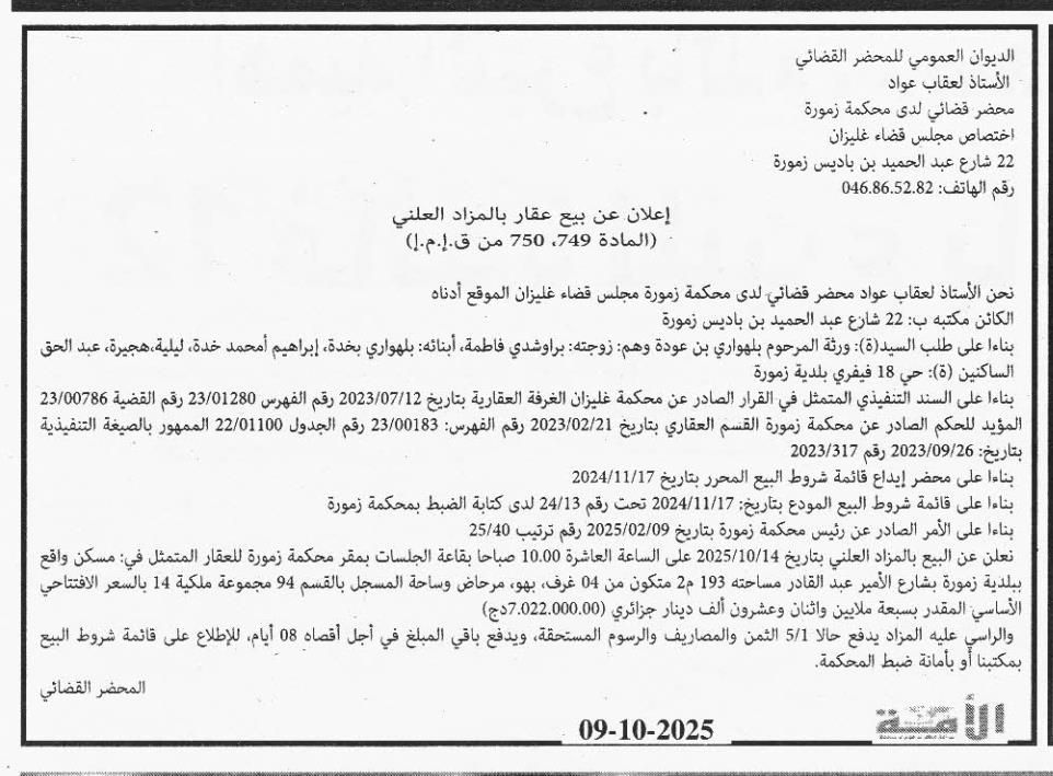 Il sera procédé à la vente au plus offrant et dernier enchérisseur le : 16/10/2025';
