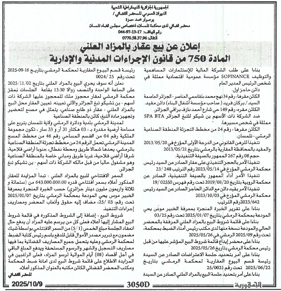 Il sera procédé à la vente au plus offrant et dernier enchérisseur le : 16/10/2025';