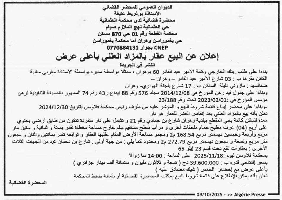 Il sera procédé à la vente au plus offrant et dernier enchérisseur le :