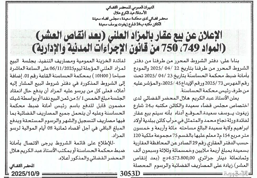 Il sera procédé à la vente au plus offrant et dernier enchérisseur le :