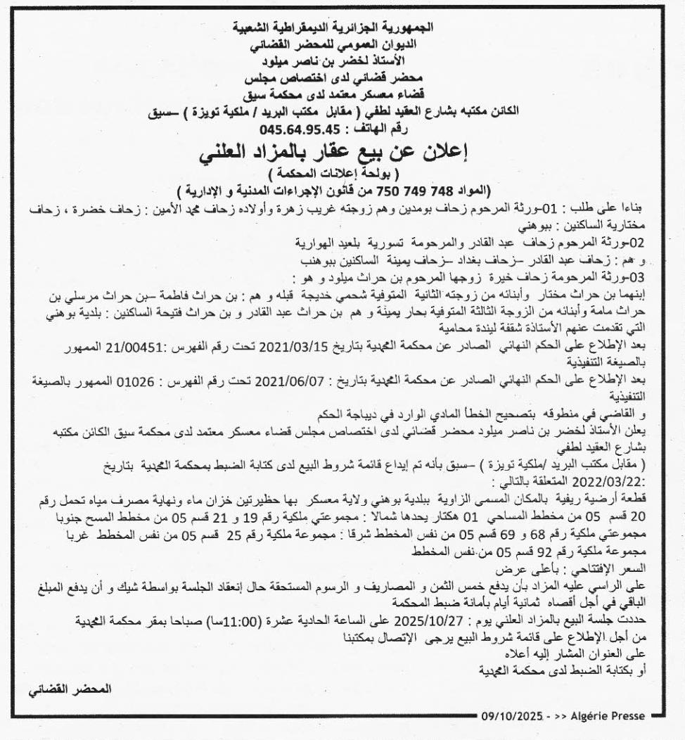 Il sera procédé à la vente au plus offrant et dernier enchérisseur le :