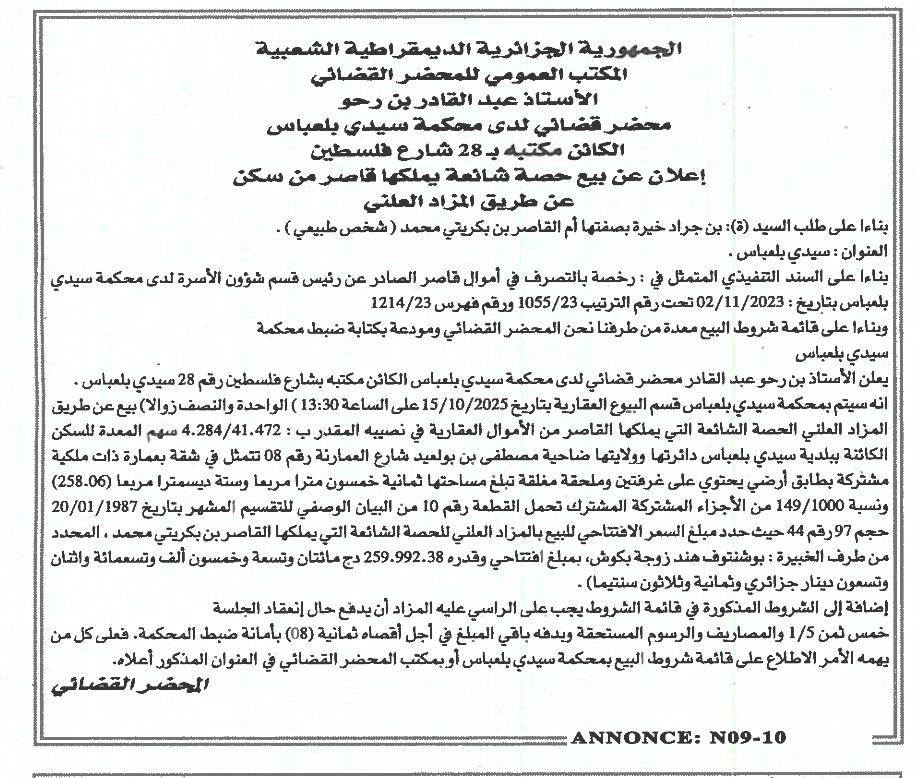 Il sera procédé à la vente au plus offrant et dernier enchérisseur le :