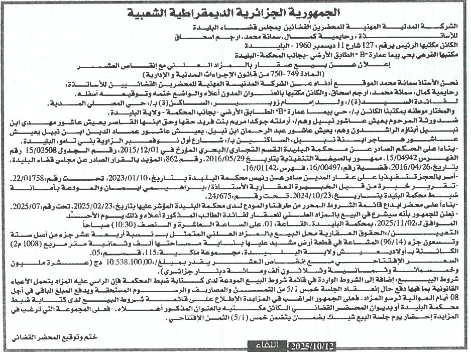 Il sera procédé à la vente au plus offrant et dernier enchérisseur le :