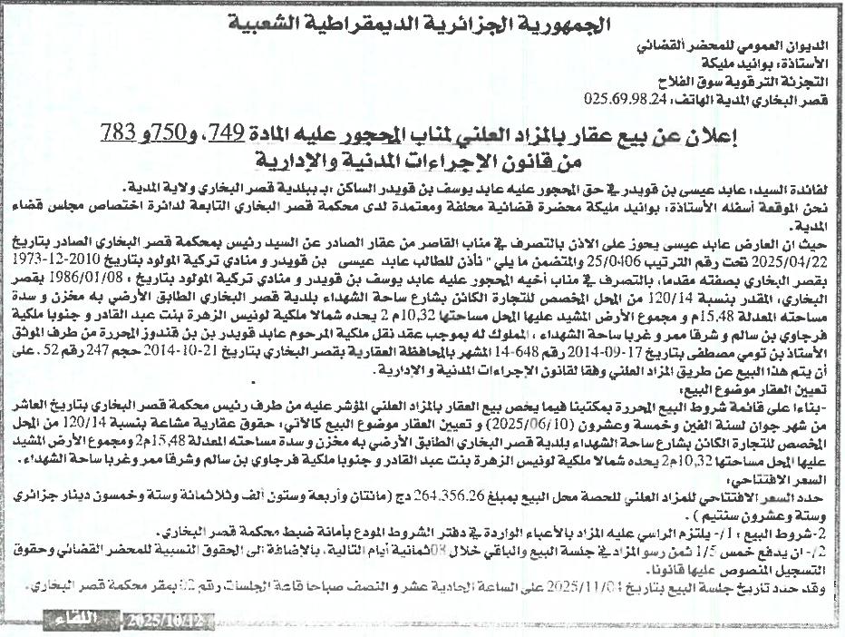 Il sera procédé à la vente au plus offrant et dernier enchérisseur le :