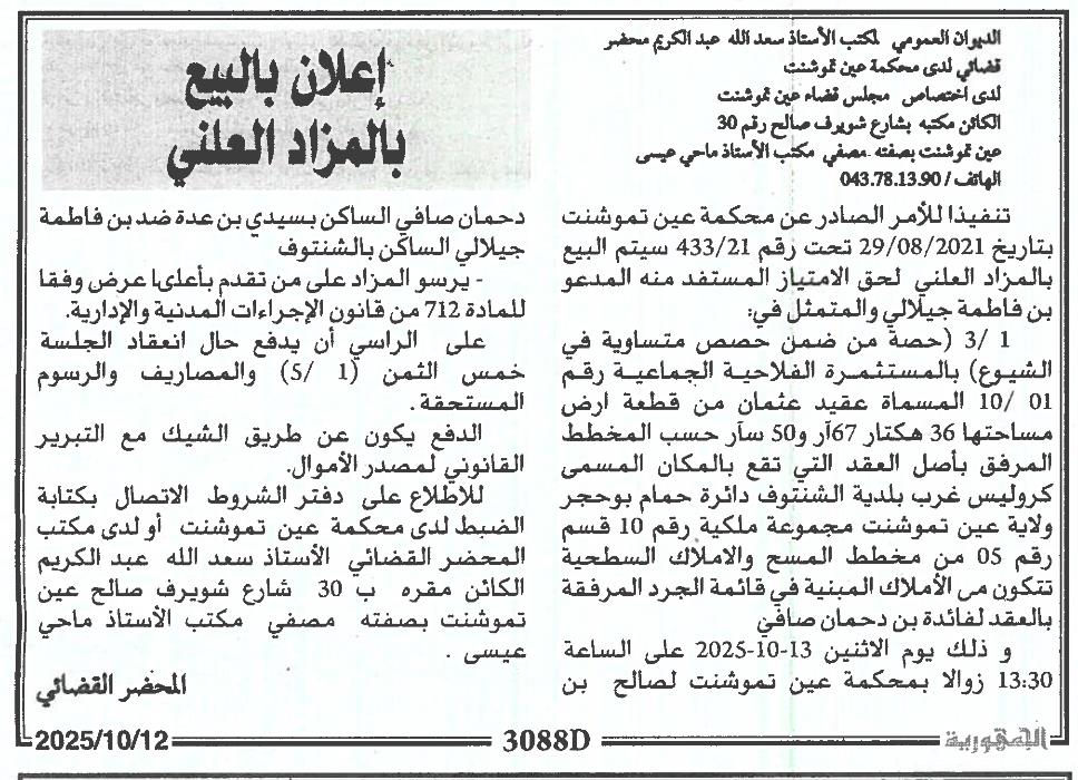 Il sera procédé à la vente au plus offrant et dernier enchérisseur le : 13/10/2025';