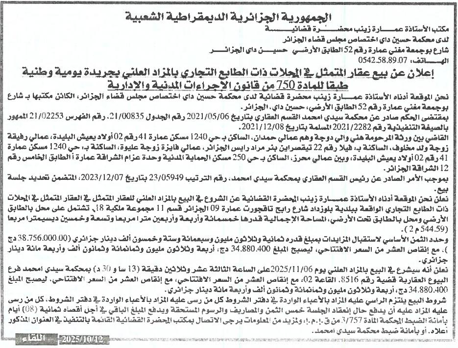 Il sera procédé à la vente au plus offrant et dernier enchérisseur le :