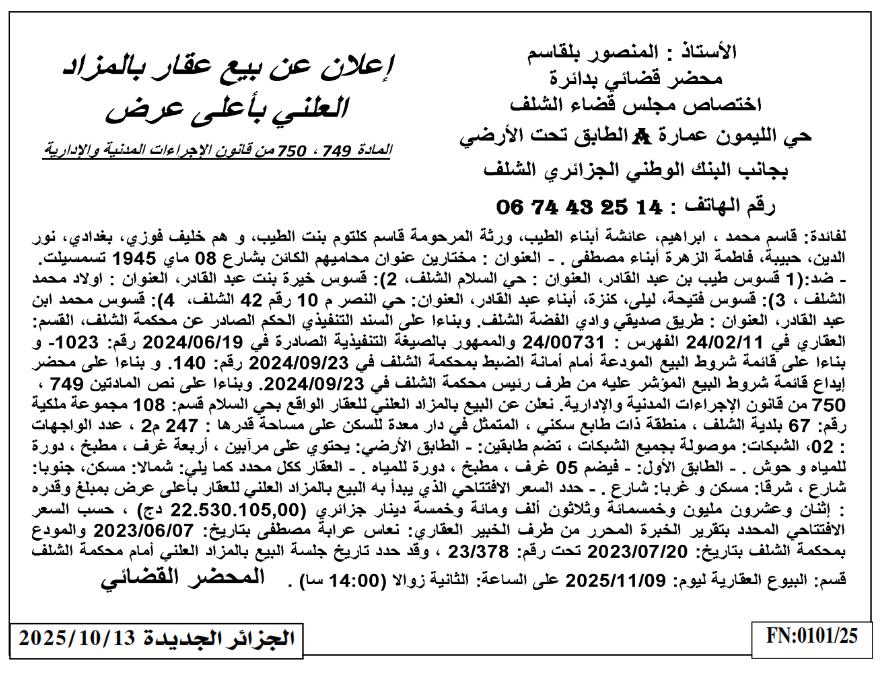 Il sera procédé à la vente au plus offrant et dernier enchérisseur le :