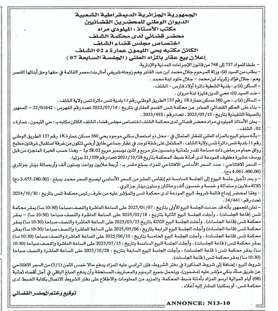 Il sera procédé à la vente au plus offrant et dernier enchérisseur le :