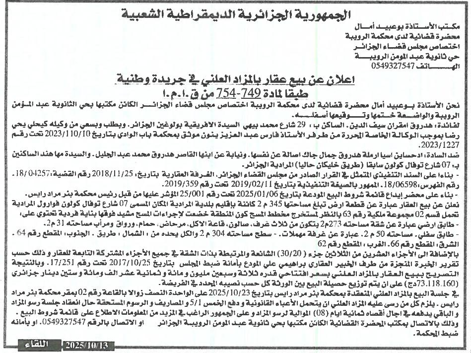 Il sera procédé à la vente au plus offrant et dernier enchérisseur le :