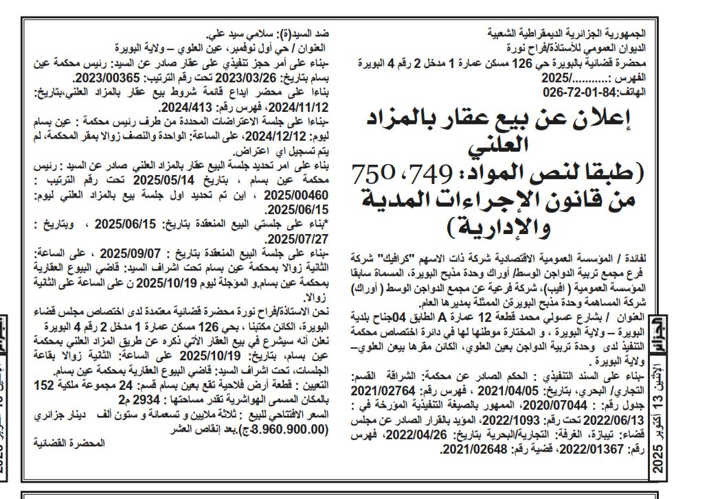 Il sera procédé à la vente au plus offrant et dernier enchérisseur le :