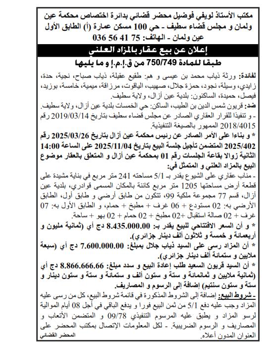 Il sera procédé à la vente au plus offrant et dernier enchérisseur le :