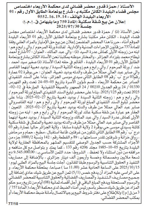 Il sera procédé à la vente au plus offrant et dernier enchérisseur le : 20/10/2025';