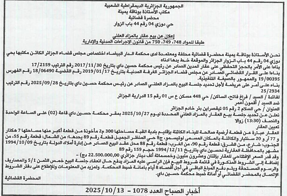 Il sera procédé à la vente au plus offrant et dernier enchérisseur le :