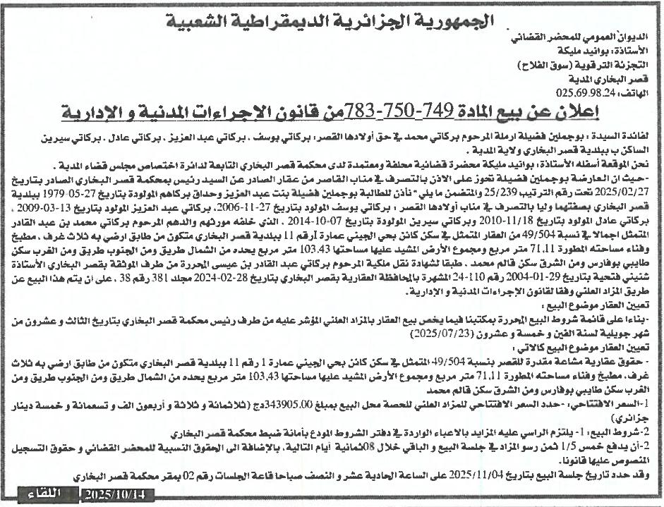 Il sera procédé à la vente au plus offrant et dernier enchérisseur le :