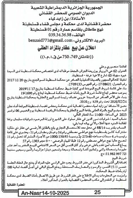 Il sera procédé à la vente au plus offrant et dernier enchérisseur le :