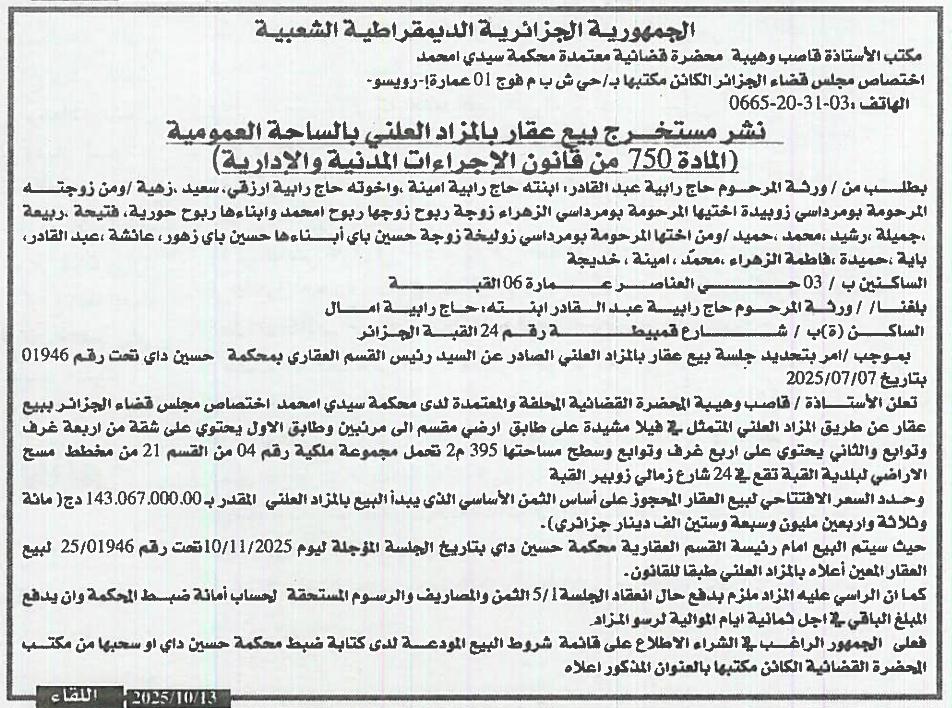 Il sera procédé à la vente au plus offrant et dernier enchérisseur le :
