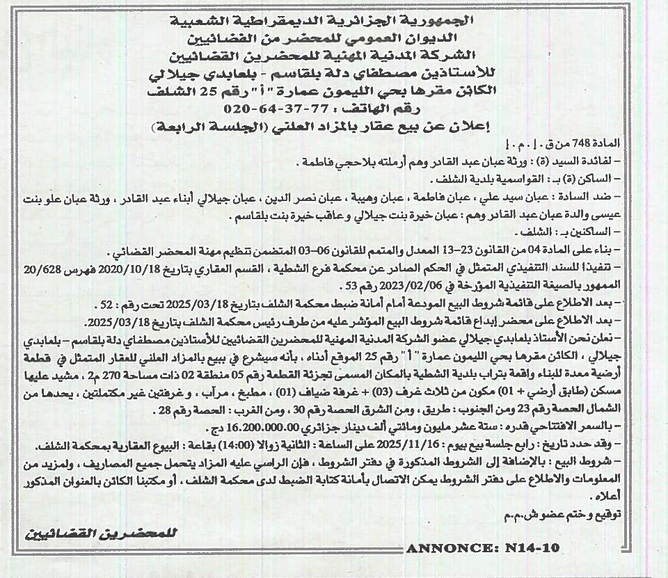 Il sera procédé à la vente au plus offrant et dernier enchérisseur le :